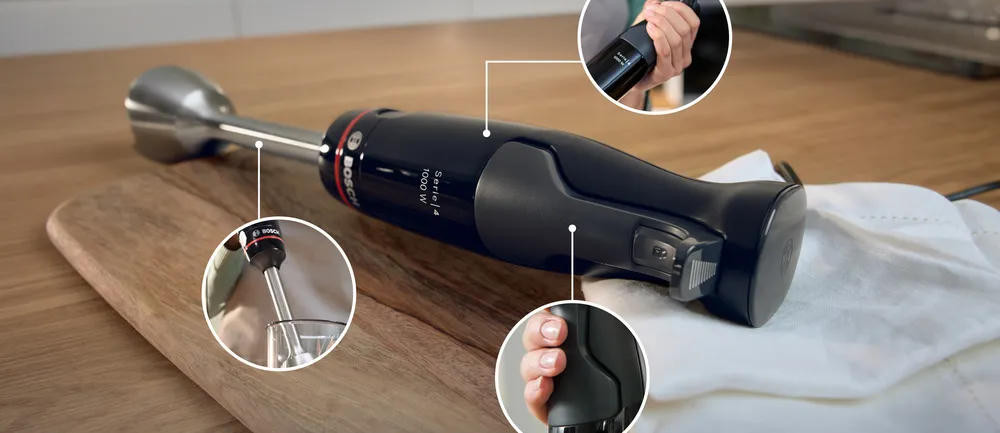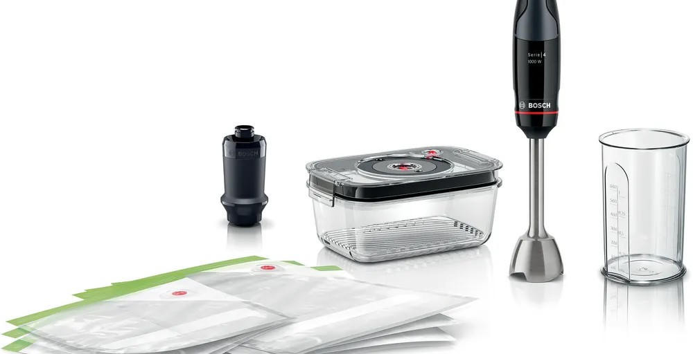 Устройство обладает эргономичной ручкой, которая обеспечивает удобный захват и уверенное управление. Бесступенчатая регулировка скорости позволяет выбирать оптимальный режим для каждого типа продуктов. Импульсный режим обеспечивает мощное и быстрое измельчение даже самых твердых продуктов. В комплекте с блендером поставляется мерный стакан, венчик для взбивания, вакуумный насос, вакуумный контейнер объемом 1.2 литра и вакуумные пакеты с замком. Все детали, подлежащие снятию, можно легко и быстро очистить в посудомоечной машине. Мощность блендера составляет 1000 Вт, что обеспечивает эффективное и быстрое измельчение продуктов.