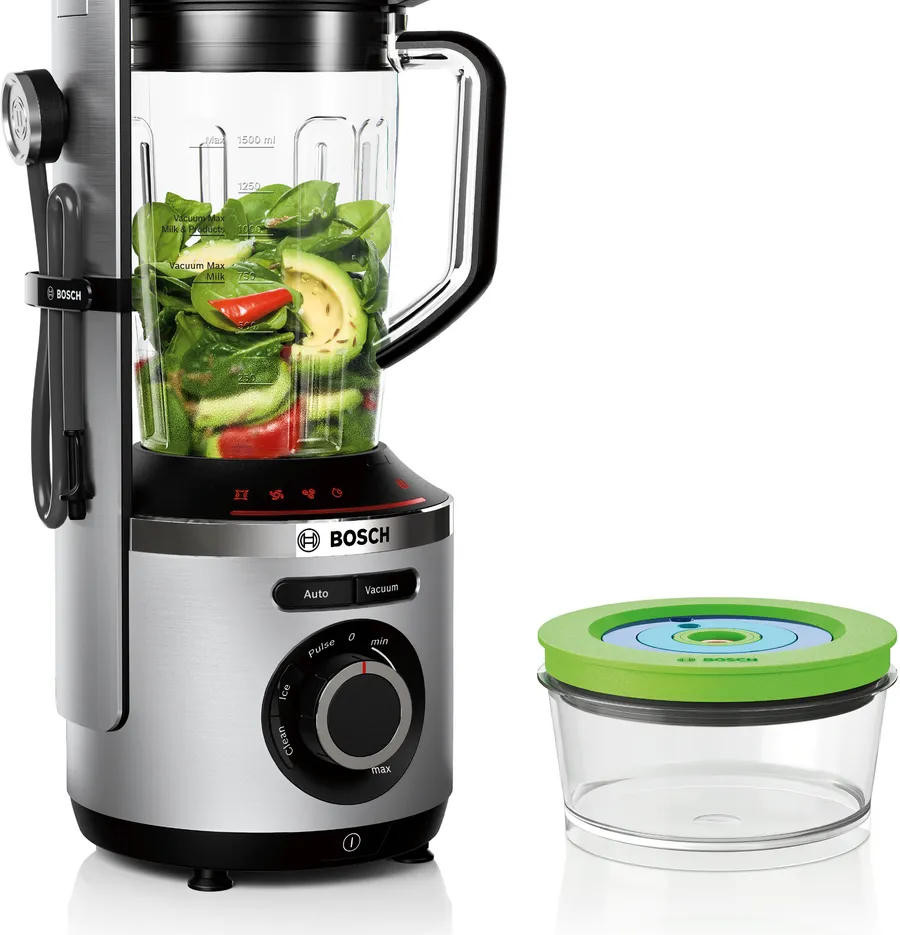 Блендер вакуумный Bosch MMBV622M - это высококачественная, функциональная и надежная кухонная техника, которая станет незаменимым помощником в приготовлении различных блюд. Дизайн блендера выполнен в стильном и современном виде. Цвет нержавеющей стали придает ему элегантность и делает его универсальным для любого интерьера кухни. Корпус из алюминия обеспечивает прочность и долговечность, а материал чаши измельчителя - тритан - гарантирует безопасность использования. Вакуумный блендер Bosch MMBV622M оснащен ножом с 6 лезвиями специальной формы, что обеспечивает эффективное измельчение и смешивание ингредиентов. Благодаря наличию бесступенчатой регулировки скорости, можно выбрать оптимальный режим работы для различных продуктов. Это устройство также имеет автоматические режимы, включая колку льда, вакуум, вакуумное смешивание и очистку, что делает его многофункциональным и удобным в использовании.