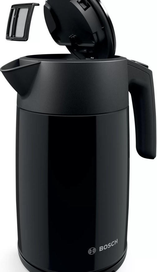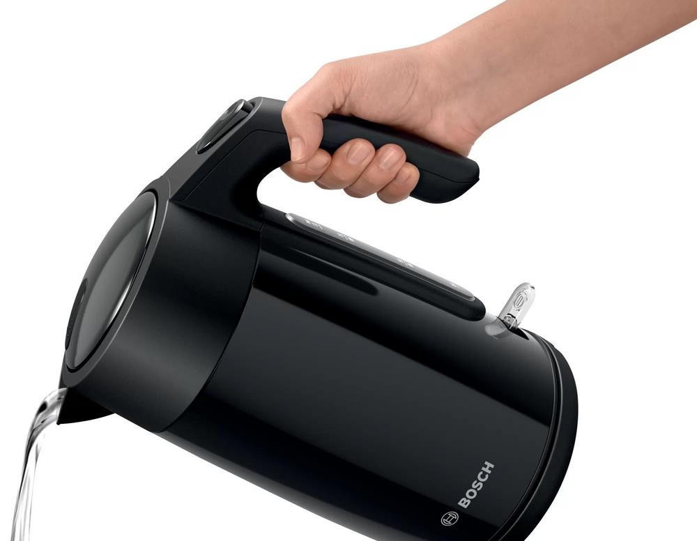 Электрический чайник Bosch TWK7L463 выполнен в чёрном цвете. Автоматическое открывание крышки и отключение прибора без воды обеспечивают безопасность эксплуатации. Угол поворота подставки составляет 360 градусов, что повышает комфорт использования.