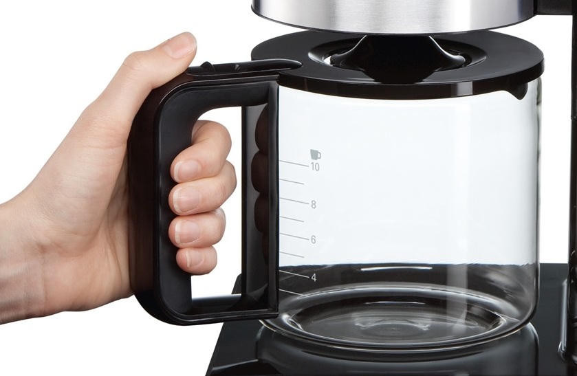 Кухонный девайс рассчитан на 10 больших и 15 малых чашек кофе. Кофеварка имеет удобную панель управления, фильтр с ручкой и большой резервуар для воды объемом 1,25 литра.