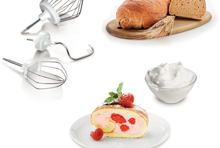 Благодаря механизму Easy Arm Lift менять насадки особенно легко: многофункциональный рычаг, на который они крепятся, приводится в движение простым нажатием кнопки. Ещё одна интересная особенность этой модели — 3D планетарное вращение насадок при замешивании теста. Крюк и венчики вращаются не просто вокруг своей оси, а по планетарному принципу, благодаря чему перемешивание происходит более равномерно и по всему объему рабочей чаши. Это позволяется избежать налипания ингредиентов на стенках.