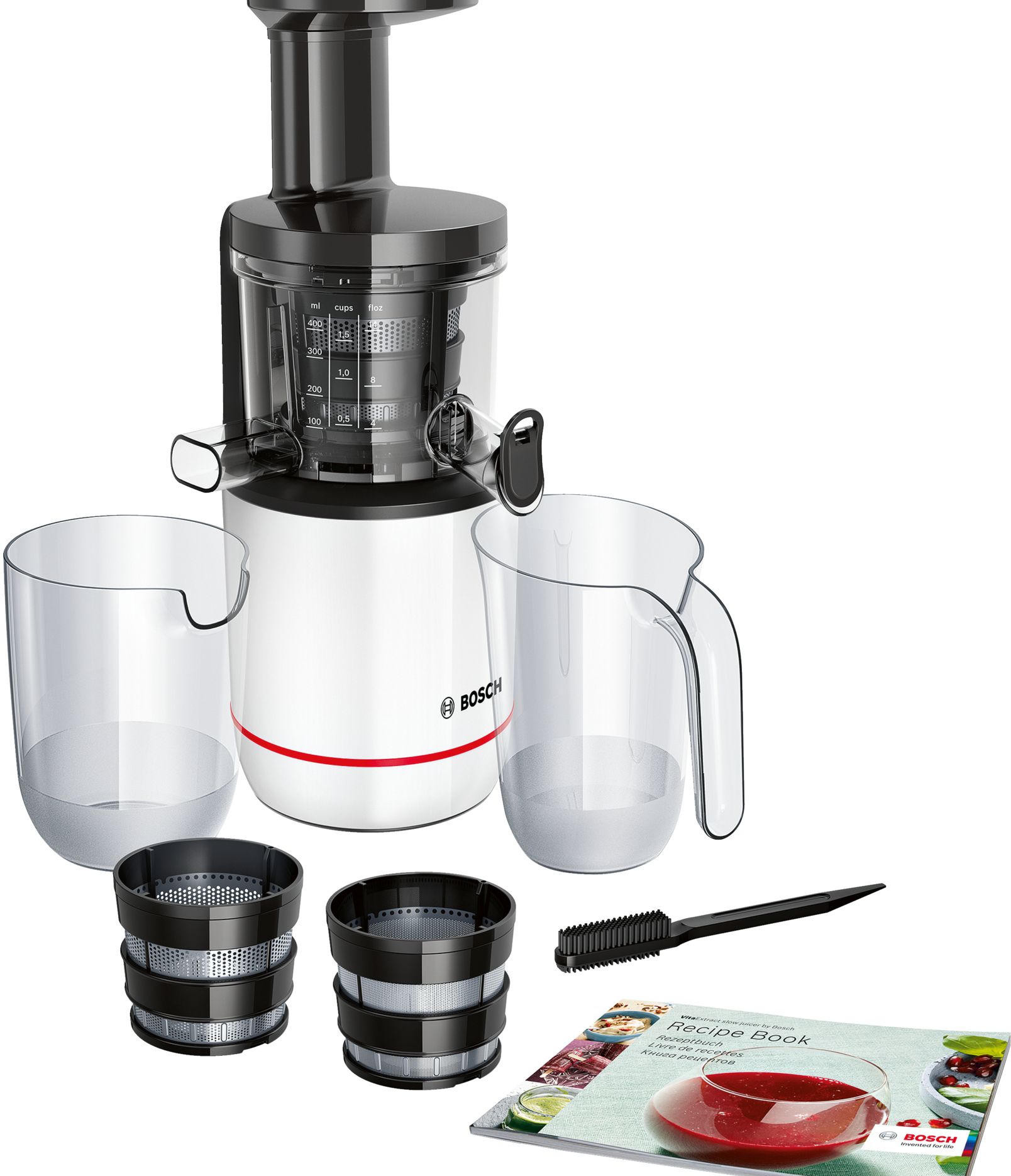 В комплекте прилагаются два фильтра с мелкими отверстиями для сока и крупными для смузи. Для удобства предусмотрен буклет с рецептами.