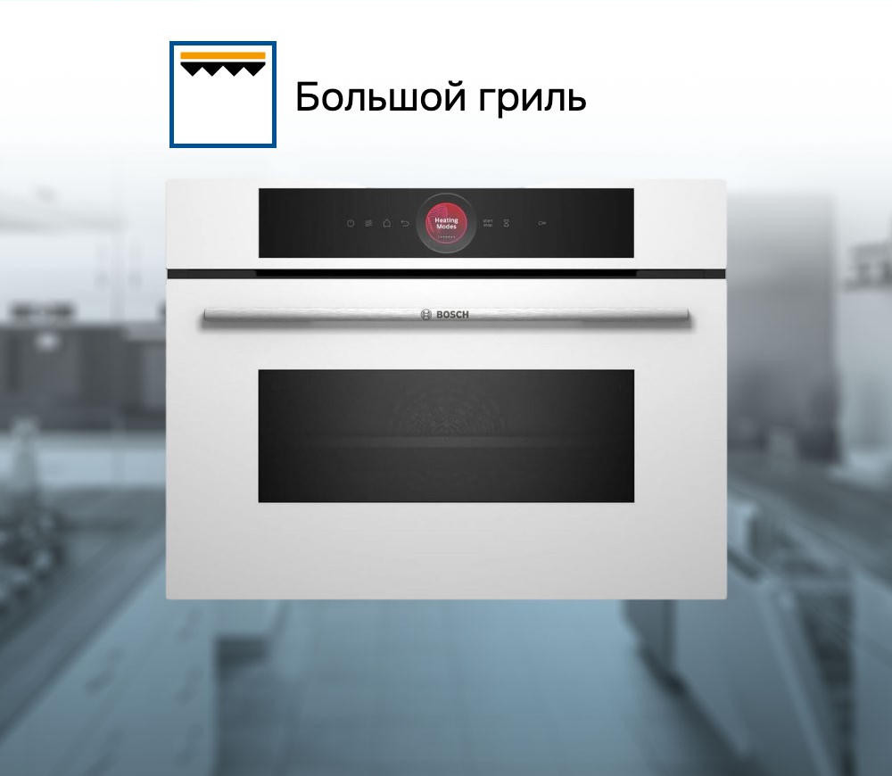 Духовой шкаф Bosch CMG7241W1 - это высококачественный прибор, который сочетает в себе элегантный дизайн и продуманные функции. Белый цвет корпуса идеально впишется в любой интерьер кухни. Благодаря объему в 45 литров, шкаф способен удовлетворить потребности даже большой семьи. Управление прибором осуществляется с помощью сенсорных элементов и 2.5-дюймового цветного TFT-дисплея, который обеспечивает простоту и удобство использования. Шкаф оборудован электронными часами и таймером, что позволяет контролировать процесс приготовления блюд и избегать пережаривания.