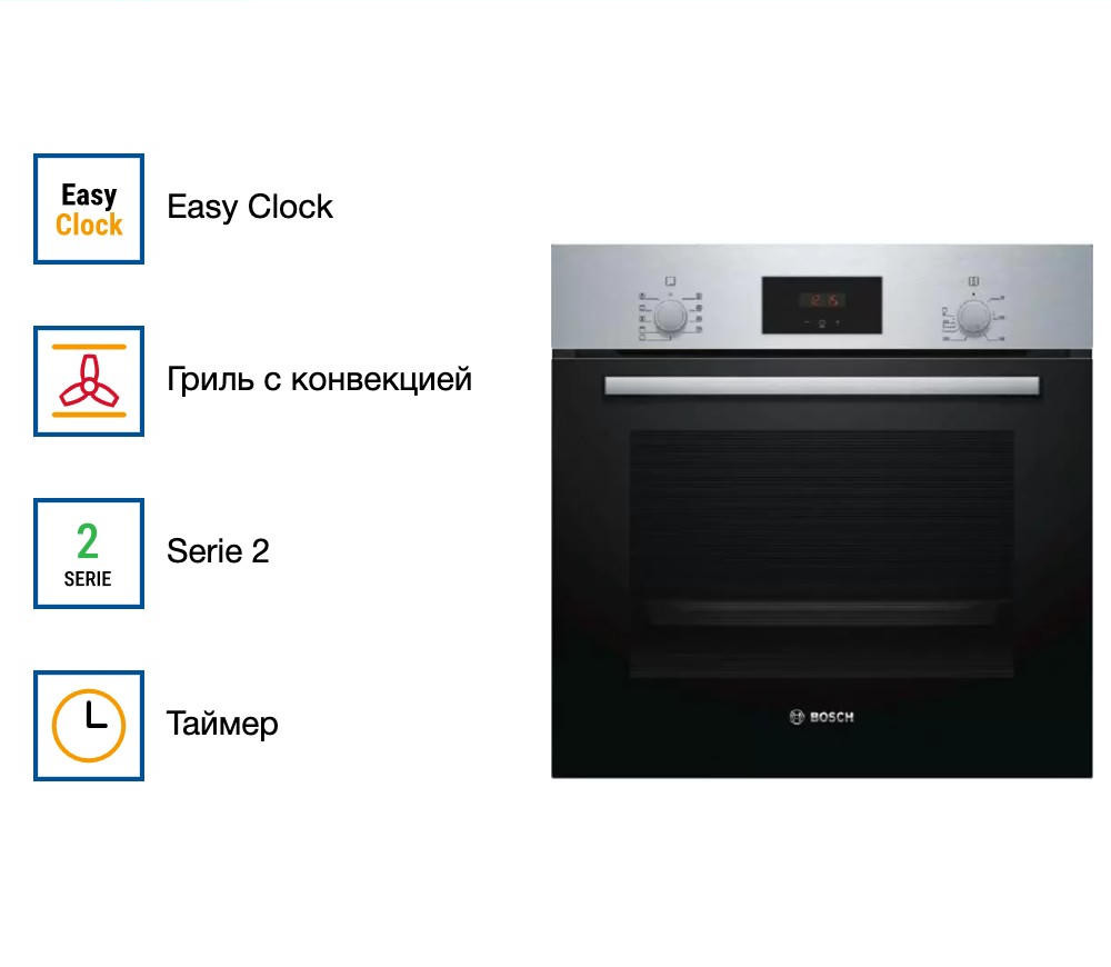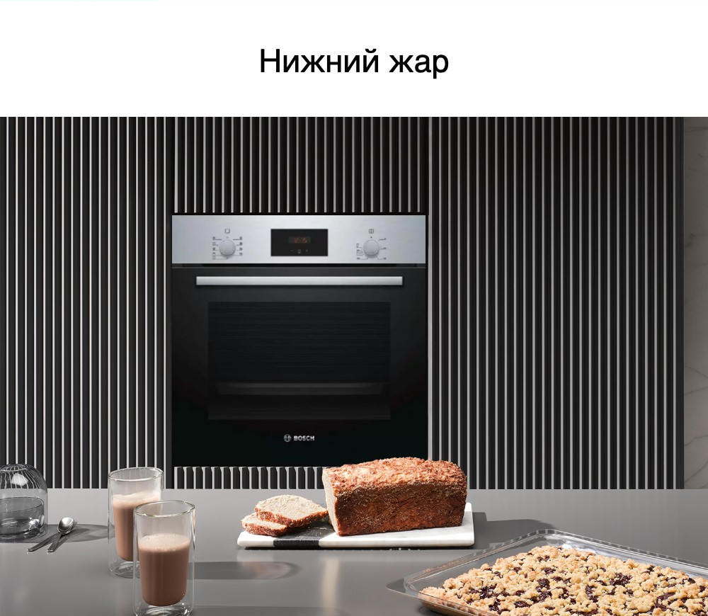 Электрический духовой шкаф Bosch HBF114ES0 есть внутренняя камера объемом 66 л, оснащенная галогенной подсветкой. Пользователь может выбирать один из семи режимов работы устройства или создавать индивидуальные программы для приготовления различных блюд. Благодаря технологии равномерной термической обработки «3D-горячий воздух» снижен риск пригорания пищи. Прибор оборудован электрическим грилем, который помогает получать хрустящую корочку.