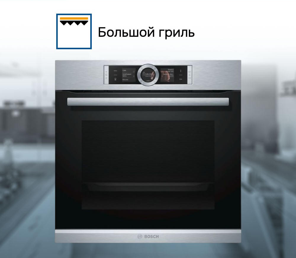 Духовой шкаф Bosch HBG6764S1 — это электрическая независимая модель из линейки Serie | 8. Ее внутренний объем составляет 71 литр, благодаря чему есть возможность запекать большие блюда. Она оформлена в цвете «нержавеющая сталь», благодаря чему отлично впишется в любой современный кухонный интерьер — например, в стиле хай-тек. Управление осуществляется посредством использования сенсорных кнопок и Control Ring. Благодаря многофункциональным часам Easy Clock можно с легкостью отслеживать время до окончания работы одной из программ.