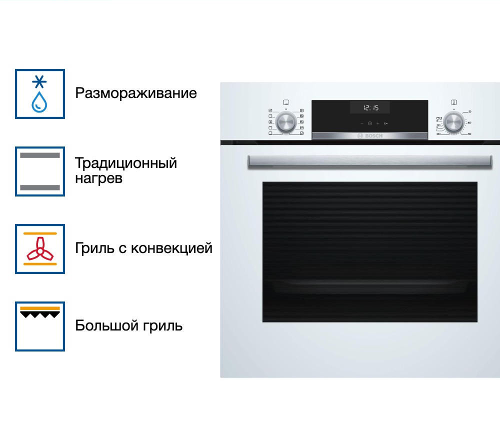Духовой шкаф Bosch HBJ558YW0Q оснащен 8 режимами нагрева, среди которых — гриль, конвекция и размораживание. В камере предусмотрено пять уровней установки противней, на двух из них установлены телескопические направляющие. Наружное стекло нагревается не более чем до 40_С. В комплект входит комбинированная решётка и два противня (эмалированный и универсальный, противень для гриля).