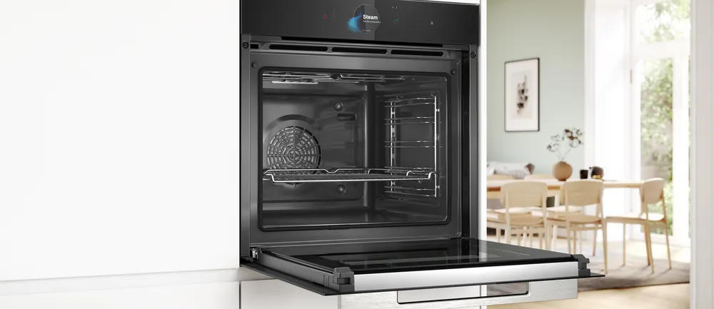 Духовой шкаф оснащен функцией Home Connect, которая позволяет управлять устройством дистанционно через приложение на смартфоне. В арсенале прибора 18 режимов нагрева, включая 4D-горячий воздух, верхний/нижний жар, большой и малый гриль, режим для пиццы, бережное тушение и даже Air Fry для приготовления блюд без использования масла. Автоматические программы и специальные режимы, такие как подъем теста и подогрев готовых блюд, делают процесс приготовления еще более удобным. Многоточечный термощуп PerfectRoast и сенсор для выпечки PerfectBake обеспечивают идеальные результаты при приготовлении различных блюд. Прибор также оснащен системой быстрого разогрева и функцией поддержания температуры. Дверца шкафа откидная, оснащена амортизатором SoftClose для мягкого и бесшумного закрытия. Внутреннее освещение LED обеспечивает хороший обзор содержимого. Очистка прибора осуществляется пиролитическим методом – при высокой температуре грязь превращается в пепел, который легко удаляется.