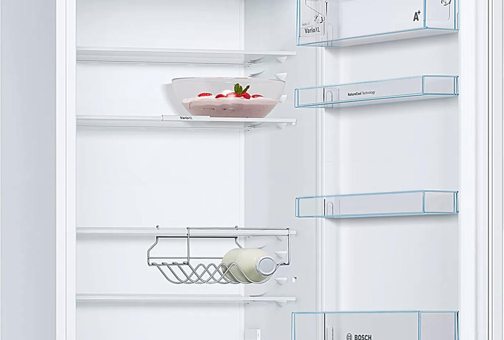 Холодильное отделение Бош KGE39XW21R с полезным объемом в 257 л оснащено полками из ударопрочного стекла, 1 из которых зафиксирована, а местоположение других можно менять на свое усмотрение.