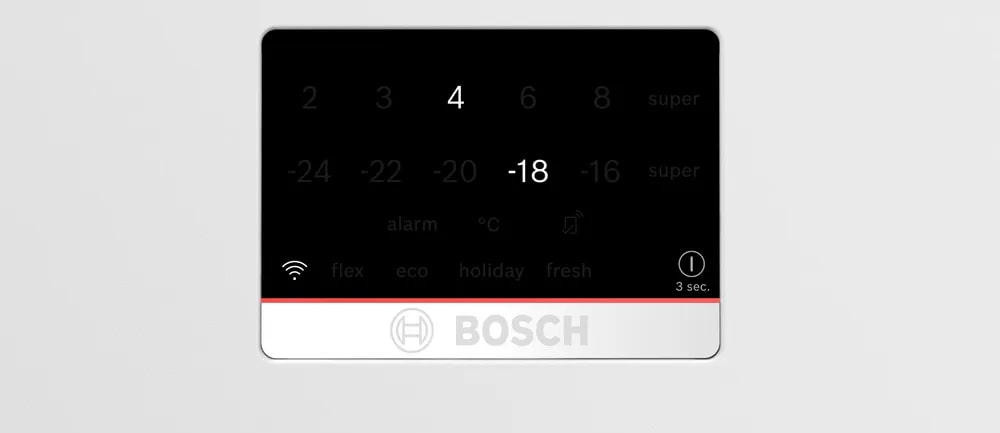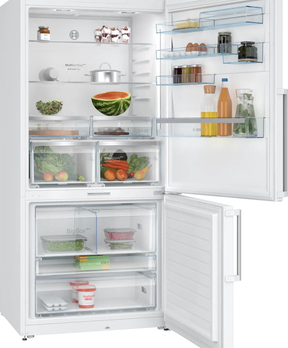Двухкамерный холодильник Bosch KGP86FWC0N выполнен в строгом белом цвете и демонстрирует продуманную эргономику в сочетании с лаконичным внешним видом. Вертикальная накладная ручка подчёркивает монументальность корпуса, дверной упор расположен справа, при этом предусмотрена возможность перенавешивания полотна для удобства расстановки в кухонном пространстве. Внутреннее устройство разделено на два основных отсека: холодильный и морозильный, причём холодный блок занимает верхнюю часть, а морозильный расположен внизу, что упрощает доступ к часто используемым продуктам. Общий полезный объём достигает внушительных 624 литров — 422 литра выделено под охлаждение и 202 литра отведено для заморозки. Для сохранения качества продуктов использованы современные технологические подходы: динамическая система распределения воздуха MultiAirflow обеспечивает равномерное распределение температуры по полкам, а функция суперохлаждения позволяет быстро понизить температуру свежих закладок, минимизируя влияние на уже охлаждённые продукты.