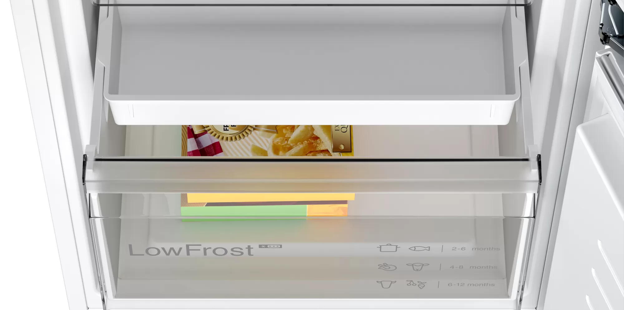 Энергопотребление устройства соответствует классу E (старое обозначение A++), с годовым расходом электроэнергии в 229 кВтч. Это позволяет существенно экономить на электроэнергии, не жертвуя функциональностью. Возможность перенавешивания двери и монтаж с использованием плоских шарниров делают установку и эксплуатацию удобной и гибкой.