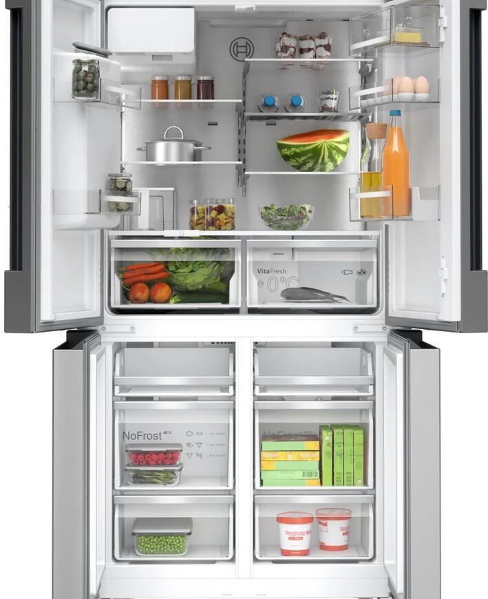 Внутреннее пространство организовано с прицелом на рациональное хранение большого ассортимента продуктов: общая полезная вместимость составляет 574 л, из которых холодильная камера даёт 375 л, а морозильная — 199 л. Внутреннее светодиодное освещение равномерно освещает полки из высокопрочного стекла, среди которых пять расположены в холодильной секции, четыре регулируемые по высоте и одна фиксированная для устойчивых тяжёлых предметов. На дверце размещены пять полочных модулей, включая полку для бутылок и ёмкость для яиц, что помогает распределить нагрузку и сохранить порядок. Зона свежести VitaFresh 0°С предоставляет оптимальные условия для овощей, фруктов и скоропортящихся продуктов, позволяя дольше сохранять текстуру и вкус без использования дополнительных упаковочных материалов.