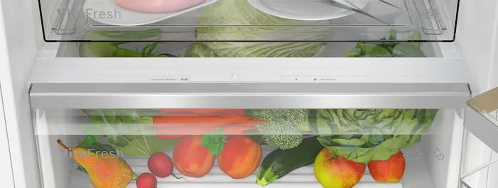 Внутреннее освещение холодильной камеры выполнено на светодиодах, что обеспечивает яркое и равномерное освещение. В морозильной камере предусмотрено три ящика, а также ванночка для льда. Система охлаждения NoFrost предотвращает образование инея, а автоматическая система размораживания облегчает уход за холодильником.
