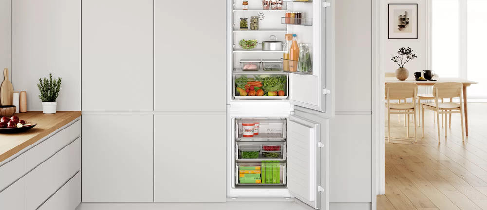 Встраиваемый двухкамерный холодильник Bosch KIN86NSF0 оснащен светодиодным освещением, не создает бликов, а также не требует постоянного замена. Контейнер Multi Box XXL позволяет вмести целый арбуз. Технология FreshSense сохраняет приятный климат для продуктов, не делая их слишком мягким или твёрдыми.