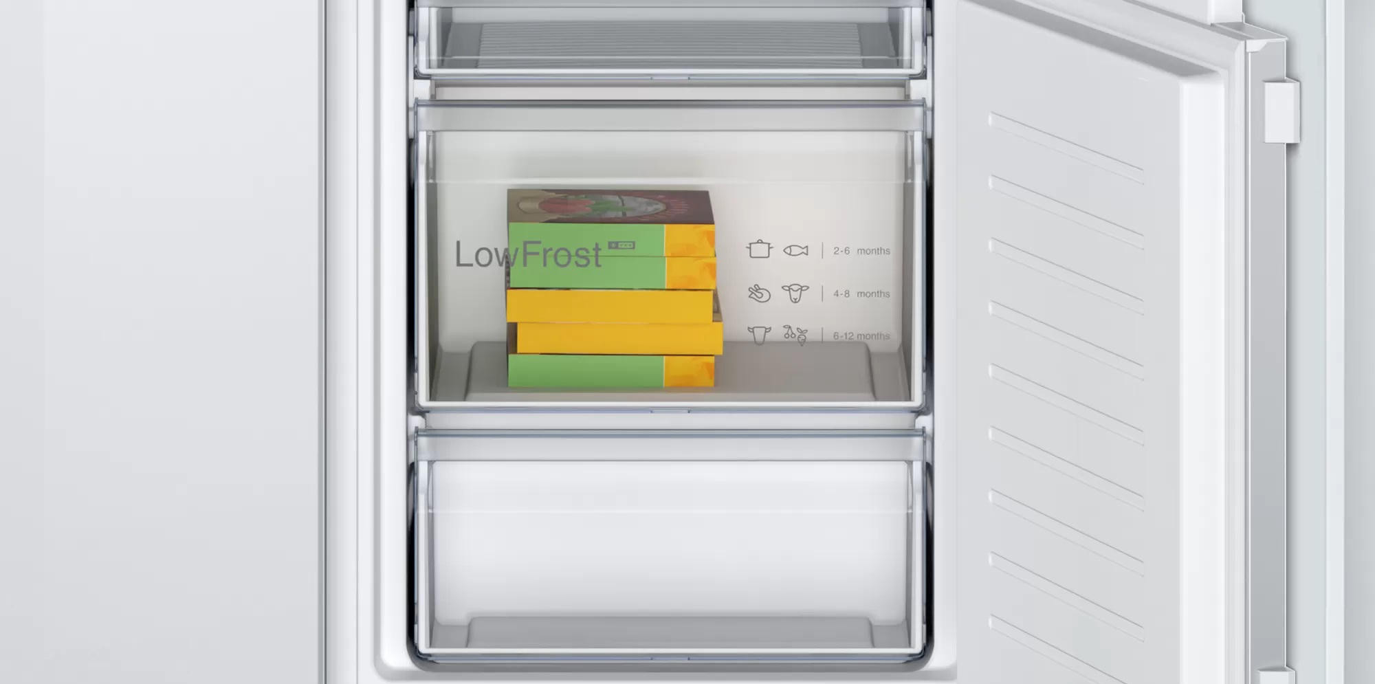 Встраиваемый холодильник Bosch KIV 86 NFF0 оснащен системой EcoAirflow — оптимальная циркуляция воздуха и постоянная температура охлаждения. Ящик Big Box: идеально подходит для размещения морозильных ящиков или крупных замороженных товаров. Светодиодное освещение потребляет меньше энергии, чем обычное освещение холодильника и прослужит в течение всего жизненного цикла устройства.