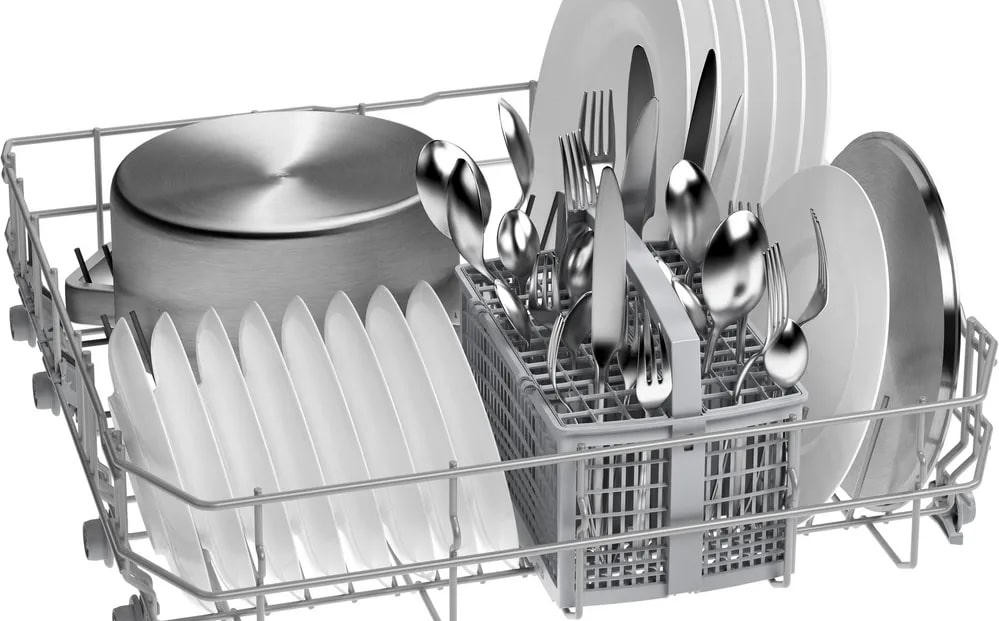 Посудомоечная машина Bosch SMS26AW00Q способна вместить до 12 комплектов покрывает потребности небольшой семьи или пары, при этом комплектность корзин — две полные секции с регулируемой по высоте верхней корзиной на системе Rackmatic-3 — упрощает размещение высоких бокалов, кастрюль и тарелок. В верхнем ящике предусмотрены складные держатели для тарелок (две секции), нижняя камера также оснащена двумя складными элементами для посуды, а внизу располагается удобная корзина для столовых приборов. Пять стандартных программ покрывают самые распространенные сценарии эксплуатации, а индикаторы наличия ополаскивателя и соли, а также отображение времени до окончания цикла помогают контролировать расход средств и планировать бытовые задачи. Функция предварительного ополаскивания поддерживает чистоту при отсрочке запуска, которая может быть установлена от 1 до 24 часов, после завершения программа сопровождается звуковым сигналом.