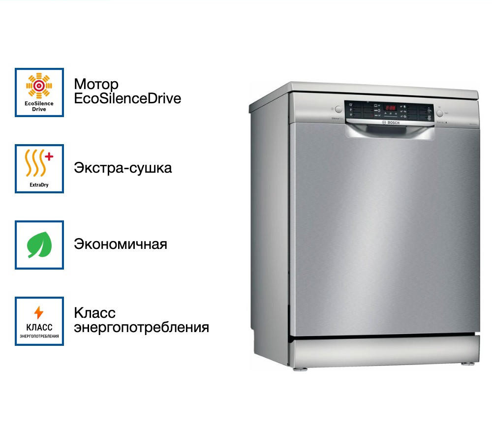 Посудомоечная машина Bosch SMS46MI20M выполнена в цвете «нержавеющая сталь» и вмещает в себя до 14 комплектов посуды. Датчик AquaSensor определяет уровень мутности воды и в зависимости от этого регулирует ее количество, что способствует более экономному расходу ресурсов. Покрытие против отпечатков пальцев поможет без труда содержать прибор в чистоте.
