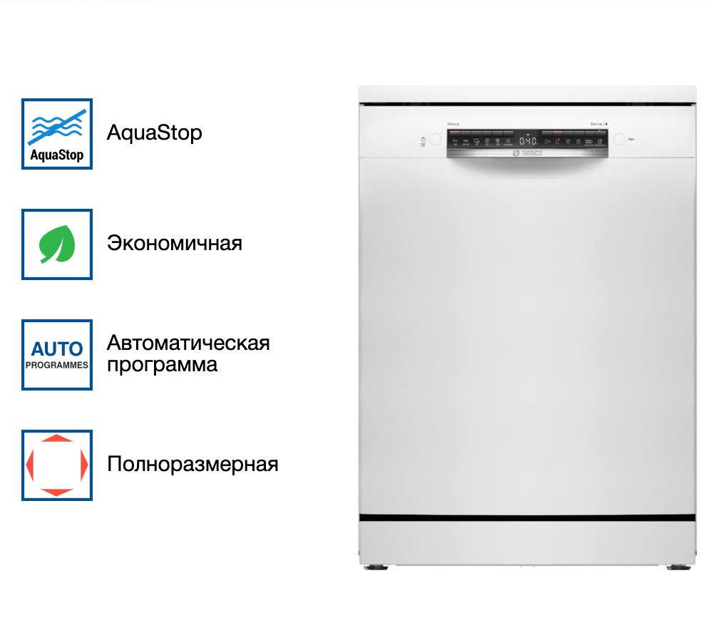 Посудомоечная машина Bosch SMS4HVW00E отличается своим стильным дизайном и функциональностью. Это отдельностоящая полноразмерная модель с конденсационной сушкой, выполненная в классическом белом цвете, что позволяет ей гармонично вписываться в любой интерьер. Серия Serie | 4, к которой принадлежит данная модель, зарекомендовала себя как надёжная и функциональная техника. Машина оснащена стандартным двигателем, способным обеспечить долгий срок службы прибора. Модель обладает широким набором программ стирки: в наличии шесть стандартных программ и четыре температурных режима. Такой выбор позволяет подобрать наиболее подходящий режим для различного типа посуды.