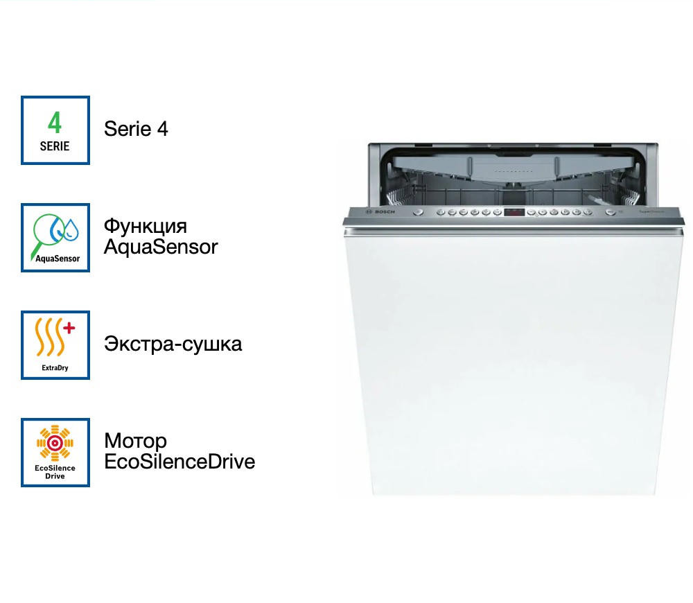 Встраиваемая посудомоечная машина Bosch SMV46KX55E оснащена системой ActiveWater, которая обеспечивает эффективное использование воды, и технологией защиты стекла, которая предотвращает повреждение деликатной стеклянной посуды. Электроника регенерации автоматически устанавливает жесткость воды, обеспечивая оптимальные условия для мытья посуды.
