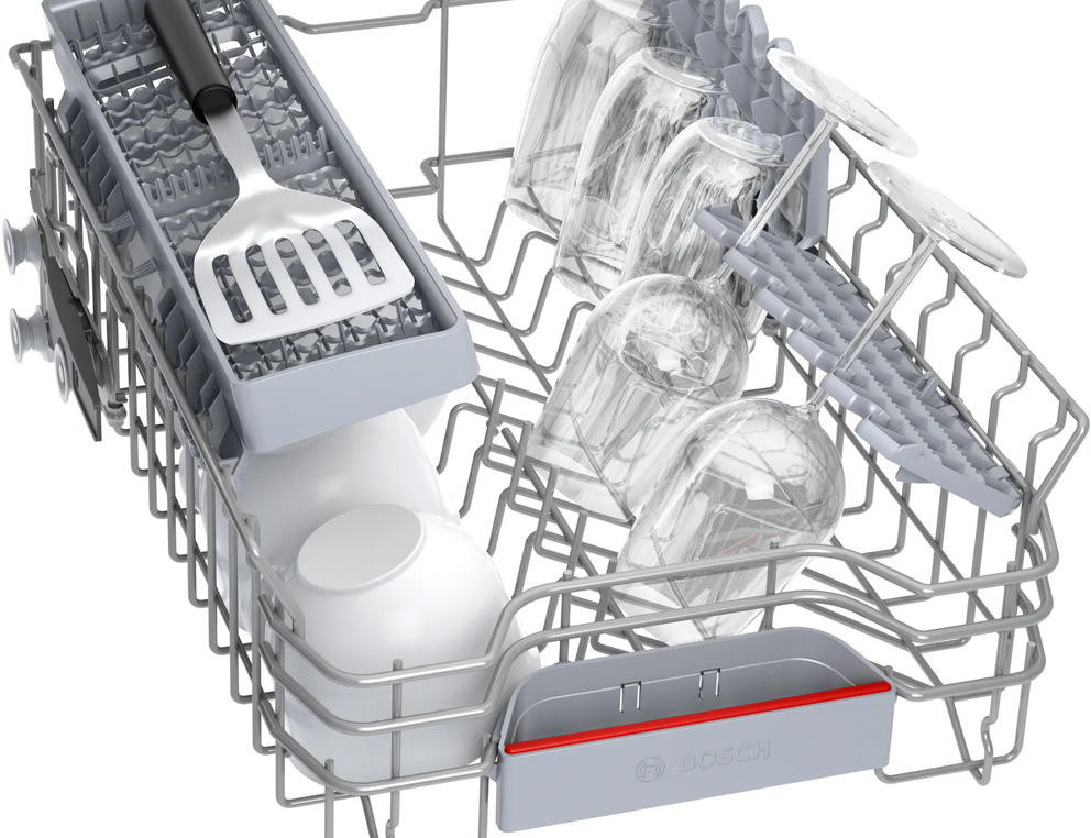Встраиваемая посудомоечная машина Bosch SPV4EKX60E выполнена в белом цвете и имеет следующие габариты: высота — 81,5 см, ширина — 44,8 см, глубина — 55 см. Она рассчитана на 9 стандартных комплектов, в которые входят тарелки, чашки и приборы; если вам нужно будет положить кастрюлю, противень или подобные крупные предметы, общий объем загрузки уменьшится. Всего в машину встроено 6 программ и 4 температурных режима, например, интенсивная, быстрая, ночная, деликатная. Быстрая программа позволяет добиться превосходных результатов мытья и сушки посуды всего за 58 минут.