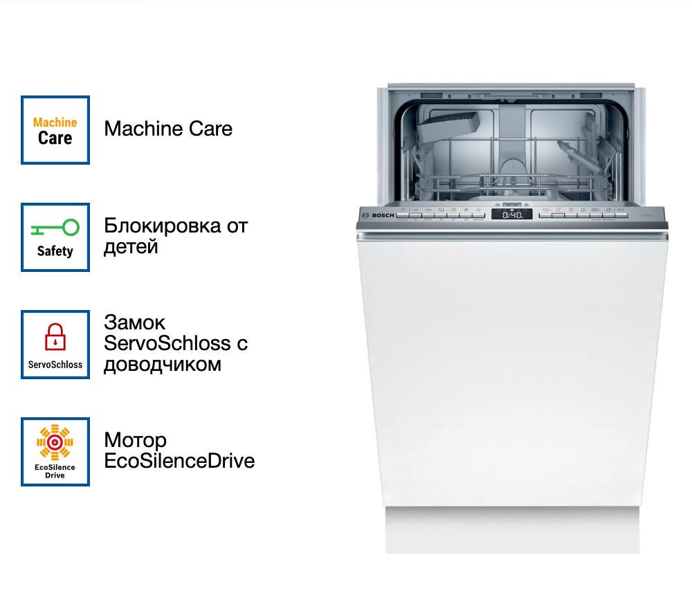 Bosch SPV4HKX45E имеет функцию Extra Dry, которая повышает температуру последнего полоскания и увеличивает время сушки, благодаря этому пластиковая посуда всегда будет сухой. Технология «Луч на полу» или InfoLight поможет вам быть в курсе об окончании работы прибора. Отложенный старт позволит запустить прибор в любое нужное вам время.