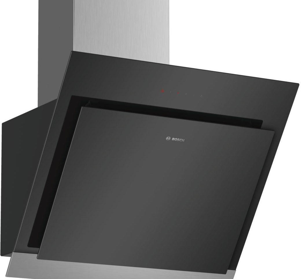 Наклонная вытяжка Bosch DWK 67HM60 эффектно смотрится в интерьере и удобна в использовании благодаря конструкции — передний край не перекрывает обзор. Забор воздуха производится по периметру прибора, что уменьшает уровень шума. Жировой фильтр закрыт стеклянным экраном. Сенсорное управление Touch Select расположено на передней панели, переключение скоростей и включение света производится легким касанием.