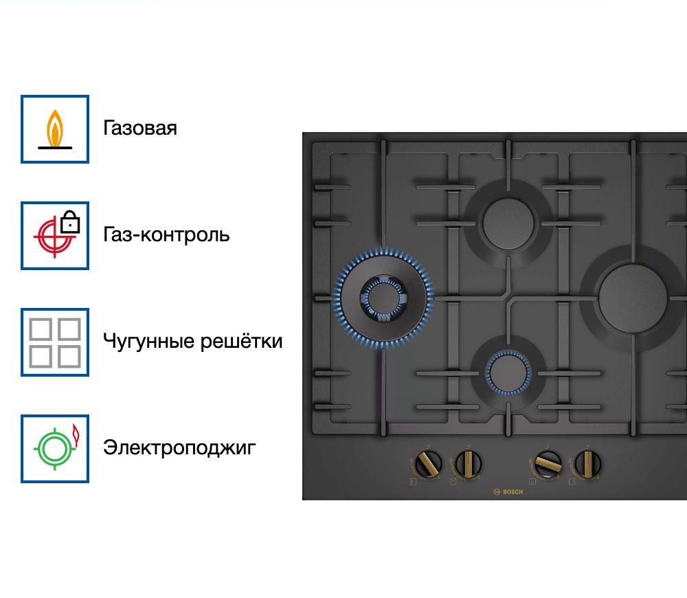 Гарантии безопасности и комфортной эксплуатации обеспечивает электроподжиг. Благодаря его наличию пламя загорается простым поворотом переключателя, без использования спичек и зажигалок. Варочная панель Бош PCI6В3B90R — залог безопасности.