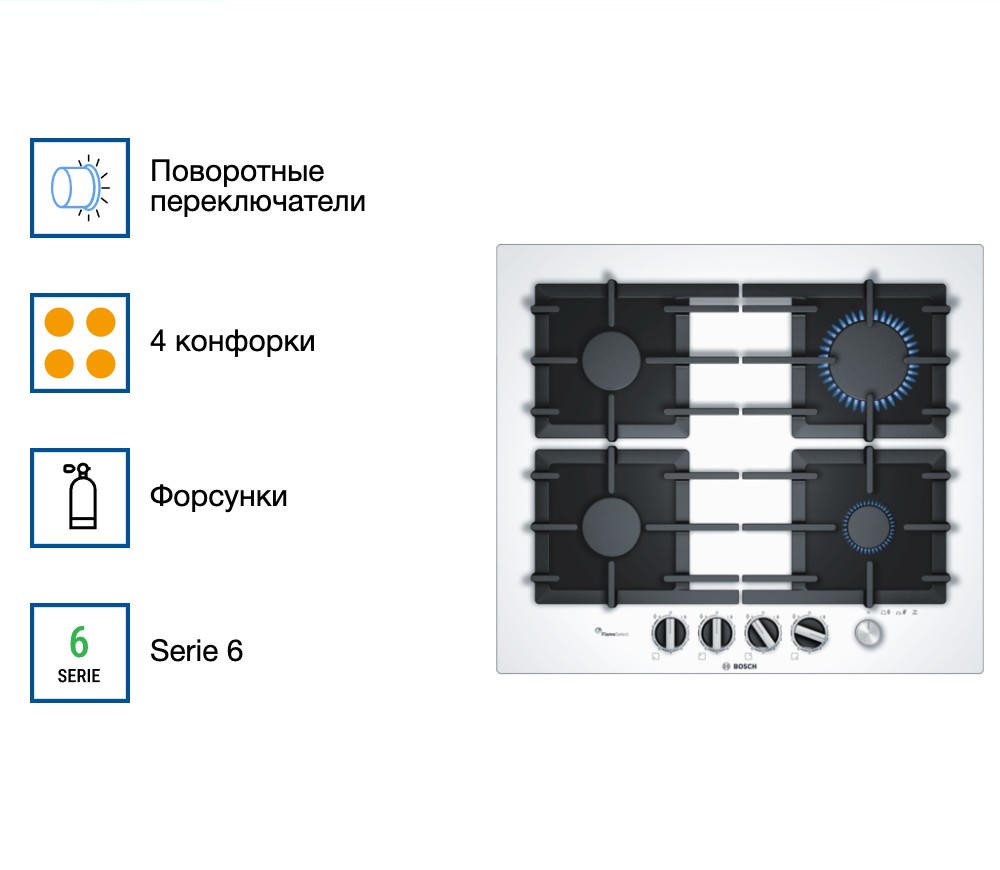 Варочная панель Bosch PPP6A2M90R независимая варочная поверхность, изготовленная из закаленного стекла HardGlass. Белое стекло удачно сочетается с черным цветом конфорок и массивной составной решеткой оригинальной формы. Устройство относится к дизайн-линии, которую отличает особая элегантность и удобство в управлении. Еще одна ее особенность — инновационные технологии. Модель оснащена функцией FlameSelect, позволяющей достигать лучших результатов приготовления. В соответствии с ней каждый из уровней мощности соответствует определенному способу приготовления, от бережного тушения до кипячения.