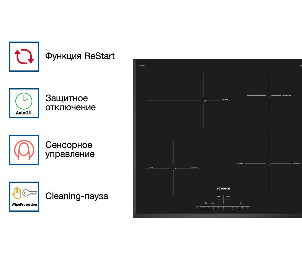 Техника оснащена четырьмя индукционными конфорками различной мощности, что позволяет выбрать оптимальный режим для приготовления различных блюд. Функция PowerBoost обеспечивает ускоренное нагревание, сокращая время приготовления. Функция ReStart позволяет восстановить последние настройки в случае отключения питания. Функция PowerManagement автоматически регулирует мощность в соответствии с потребностями приготовления пищи.