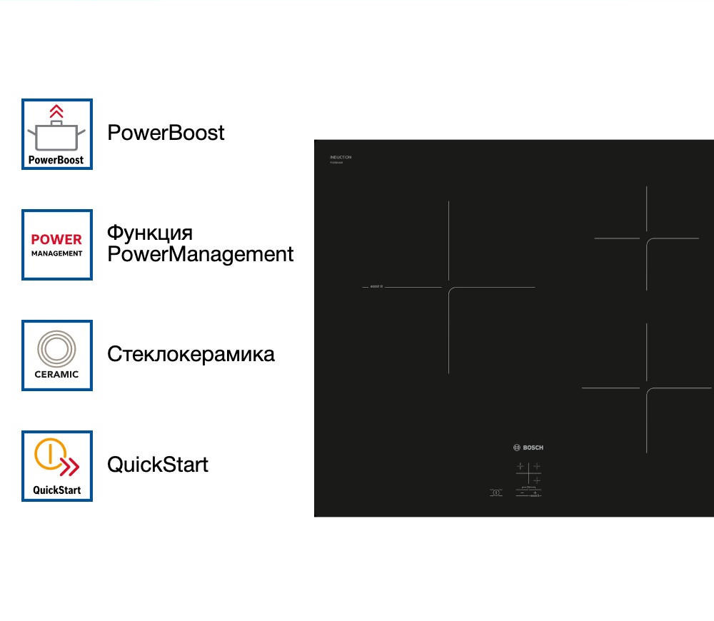 Индукционная варочная панель Bosch PUC61KAA5E обеспечит быстрый нагрев и простоту в обслуживании. Функция PowerBoost - сокращение времени приготовления. Блокировка от детей защитит панель от нежелательного включения. Индукция быстро и точно нагревание, легкость очистки и низкое энергопотребление. Функция QuickStart: точное определение положения кастрюли