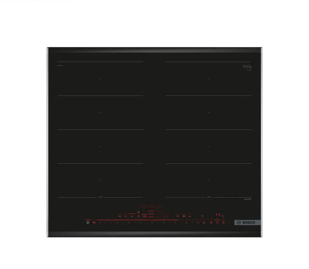 Варочная панель Bosch PXX675DV1E — это синергия изысканного дизайна и интеллектуальных технологий, созданная для тех, кто ценит как эстетику, так и эффективность на кухне. Её чёрная стеклокерамическая поверхность с фасонными кромками и тонким металлическим обрамлением выглядит современно и изящно, легко вписываясь в интерьеры любого стиля. Всего 5,1 см высоты — и панель будто растворяется в столешнице, создавая эффект лёгкости и цельности пространства.