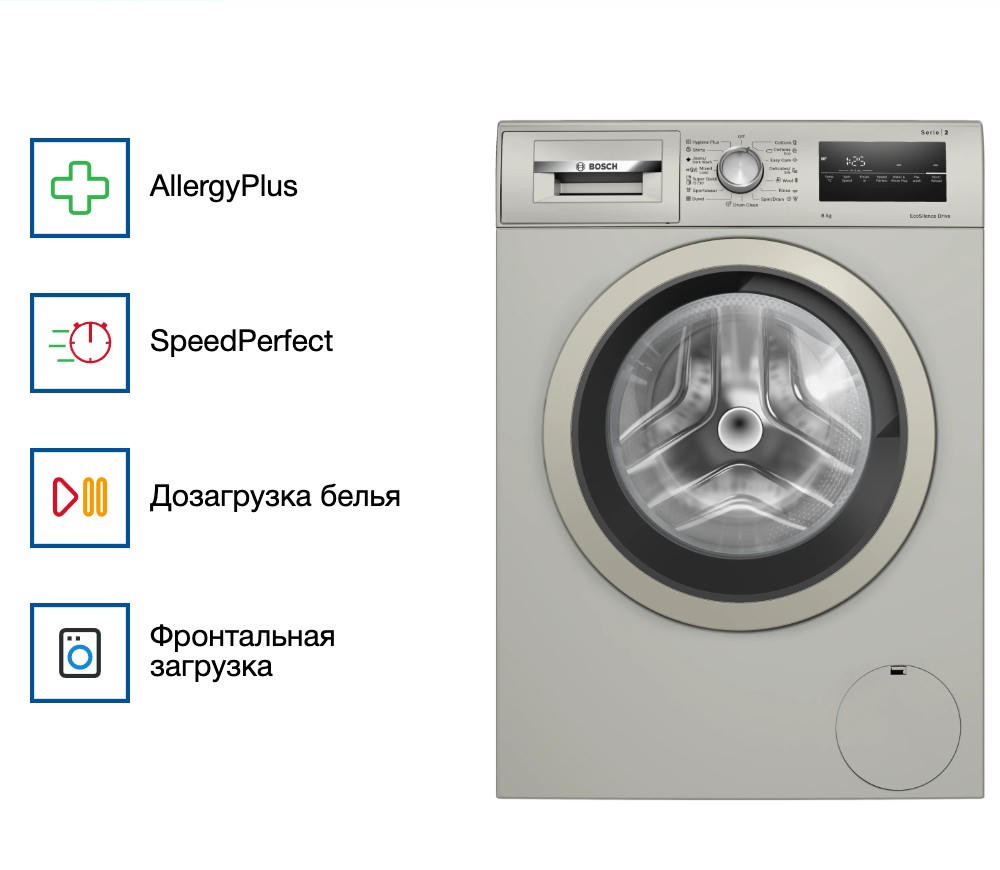 Стиральная машина Bosch WAN2420XME из линейки Serie 4 — это продуманное сочетание эстетики и инженерной надёжности. Серебристый корпус с элементами из нержавеющей стали придаёт устройству современный и утончённый облик, идеально вписывающийся как в компактную ванную, так и в отдельную прачечную. Габариты (84,5 x 60 x 63,3 см) позволяют легко разместить технику даже в условиях ограниченного пространства, не теряя при этом ни в функциональности, ни в вместимости.