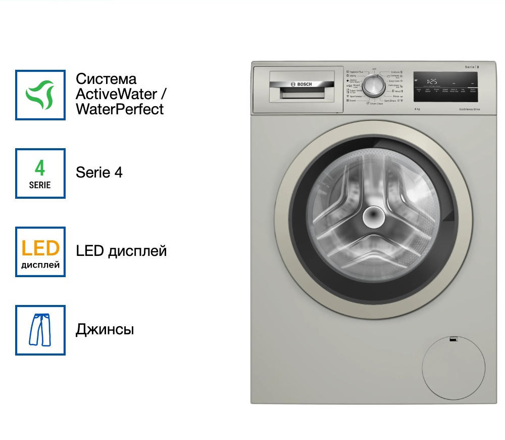 - Система ActiveWater интеллектуально регулирует расход воды и электроэнергии в зависимости от загрузки, сохраняя эффективность стирки.