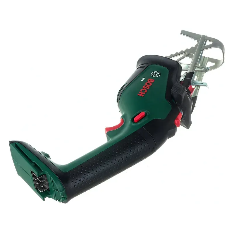 Процесс снятия и установки батареи в аккумуляторную сабельную пилу не занимает много времени благодаря простой и удобной системе фиксации. Скорость хода пильного полотна плавно регулируется нажатием на курок. Кнопка блокировки на рукоятке защищает от непреднамеренного включения. Благодаря быстрозажимному патрону замена пилок выполняется легко и быстро, не требует использования дополнительных инструментов. Зубчатым упором удобно пользоваться при обрезке веток или пластиковых труб.