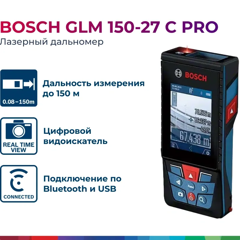 Этот прочный наружный лазерный измеритель оснащен цифровым видоискателем с функцией масштабирования для точного измерения расстояний до 150 м. Измерения и изображения автоматически сохраняются и легко читаются благодаря большому высококонтрастному 2,8-дюймовому цветному IPS-дисплею, который вращается между книжной и альбомной ориентацией. Для удобного документирования все данные можно передавать через Bluetooth в приложение Bosch MeasureOn или через USB. подключение к ПК Благодаря защите IP54, устойчивому к царапинам стеклу дисплея и удобному интерфейсу этот лазерный измеритель является удобным универсальным устройством для выполнения работ в сложных условиях.