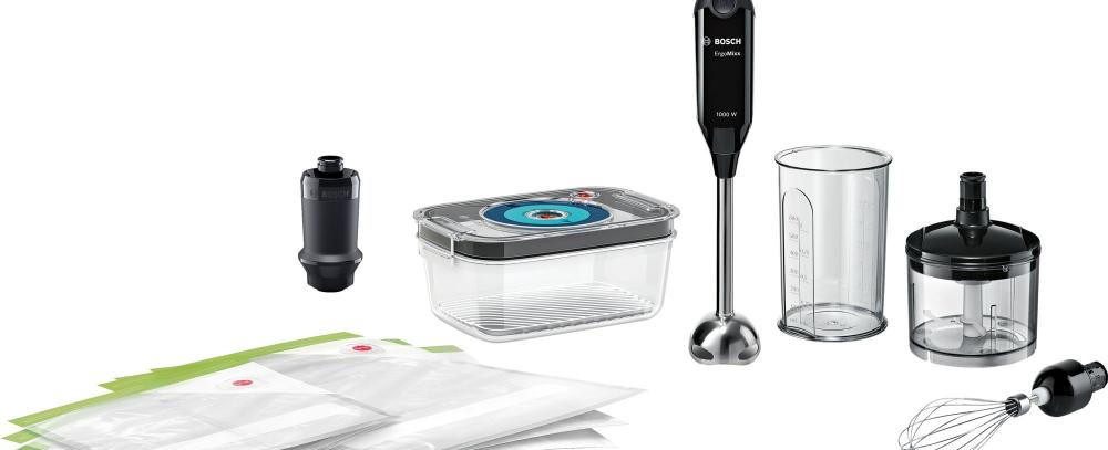 Блендер BOSCH MS6CB61V5 выполнен в черном цвете, является элементом коллекции ErgoMixx. Корпус выполнен из пластика, а погружная насадка из нержавеющей стали, которая гарантированно долго прослужит за счет повышенной прочности материала и устойчивости к внешним воздействиям. Нож блендера оснащен четырьмя лезвиями QuattroBlade. Управление осуществляется с помощью кнопок и поворотного переключателя. Эргономичная рукоять оборудована прорезиненным покрытием, которое обеспечит надежную фиксацию во время работы. В стандартную комплектацию входят: мерный стакан, чаша измельчителя с крышкой, венчик для взбивания, вакуумный насос, контейнер и пакеты с замком. Все съемные детали можно мыть в посудомоечной машине, что значительно облегчает уход за прибором.