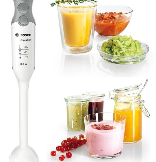 Блендер Bosch MSM 14500 — это погружная модель из серии ErgoMixx. Она представлена в сочетании белого и серого цветов, что позволяет ей вписаться в кухонный интерьер различных видов. Термостойкий пластик, из которого изготовлены корпус, погружная часть и чаша измельчителя, позволяет готовить горячие блюда — например, супы. Устройство оснащено ножом с четырьмя лезвиями QuattroBlade, которые способны качественно измельчить твердые продукты до состояния однородной массы.