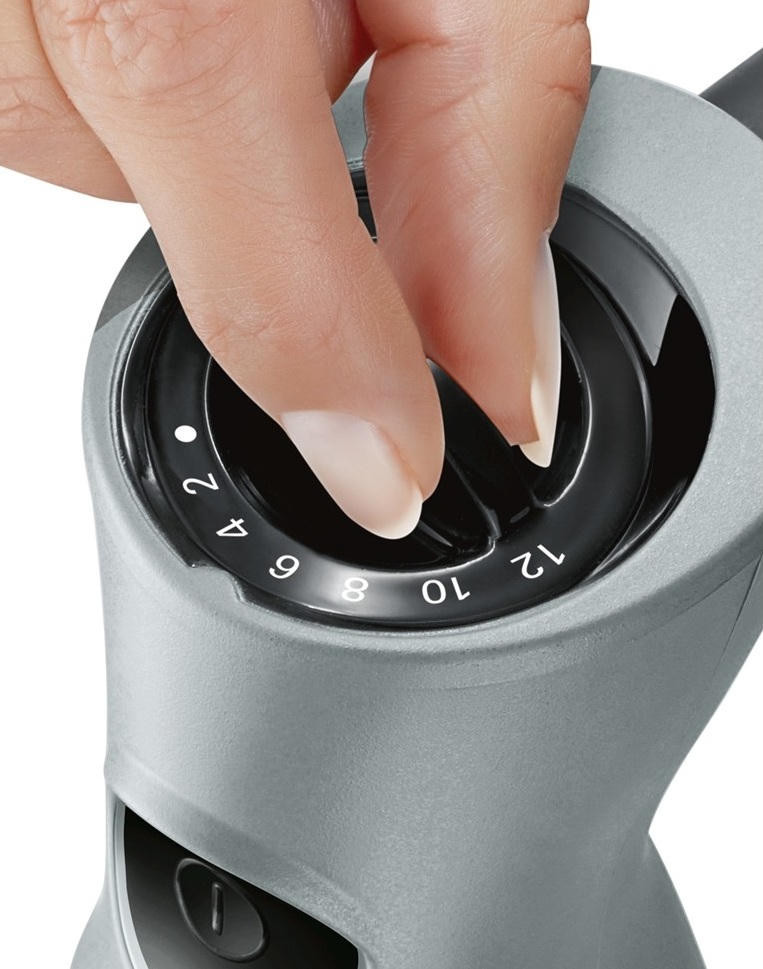 Погружной блендер MSM 67150 RU оснащен эргономичной ручкой с мягким покрытием. Прибор не выскальзывает из рук и обеспечивает надежный хват. Наличие измельчителя расширяет функциональные возможности модели. 12 режимов работы позволяют подобрать необходимую скорость для приготовления разных видов блюд. Ножка блендера и дополнительные принадлежности подходят для мытья в посудомоечной машине, что повышает комфорт использования.