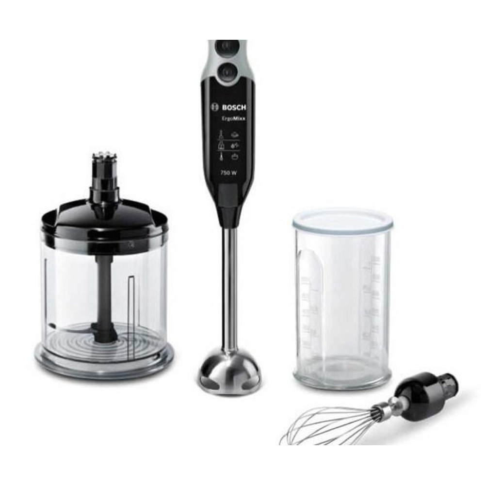 Блендер Bosch MSM 67160 оснащен металлической погружной частью, позволяющей работать с продуктами любой температуры. Турборежим дает возможность быстро перемешивать и измельчать ингредиенты. Он предназначен для приготовления небольших порций, так как емкость кувшина составляет 600 мл. В комплекте поставляются: измельчитель размера XL, мерный стакан (600 мл) и венчик для взбивания из нержавеющей стали.