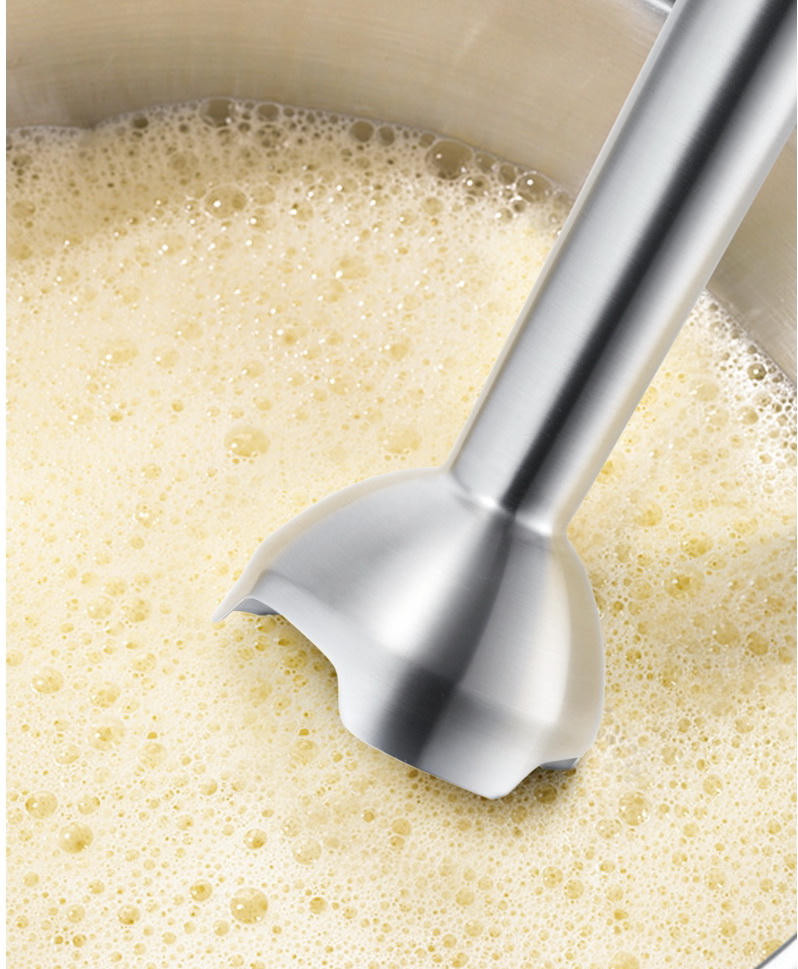 Эргономичная ручка с большими кнопками и мягким антискользящим покрытием легко ложится в руку, насадки удобно менять. Четыре острых лезвия QuattroBlade Pro быстро измельчают продукты, интенсивность обработки можно регулировать при помощи 12 скоростных режимов.