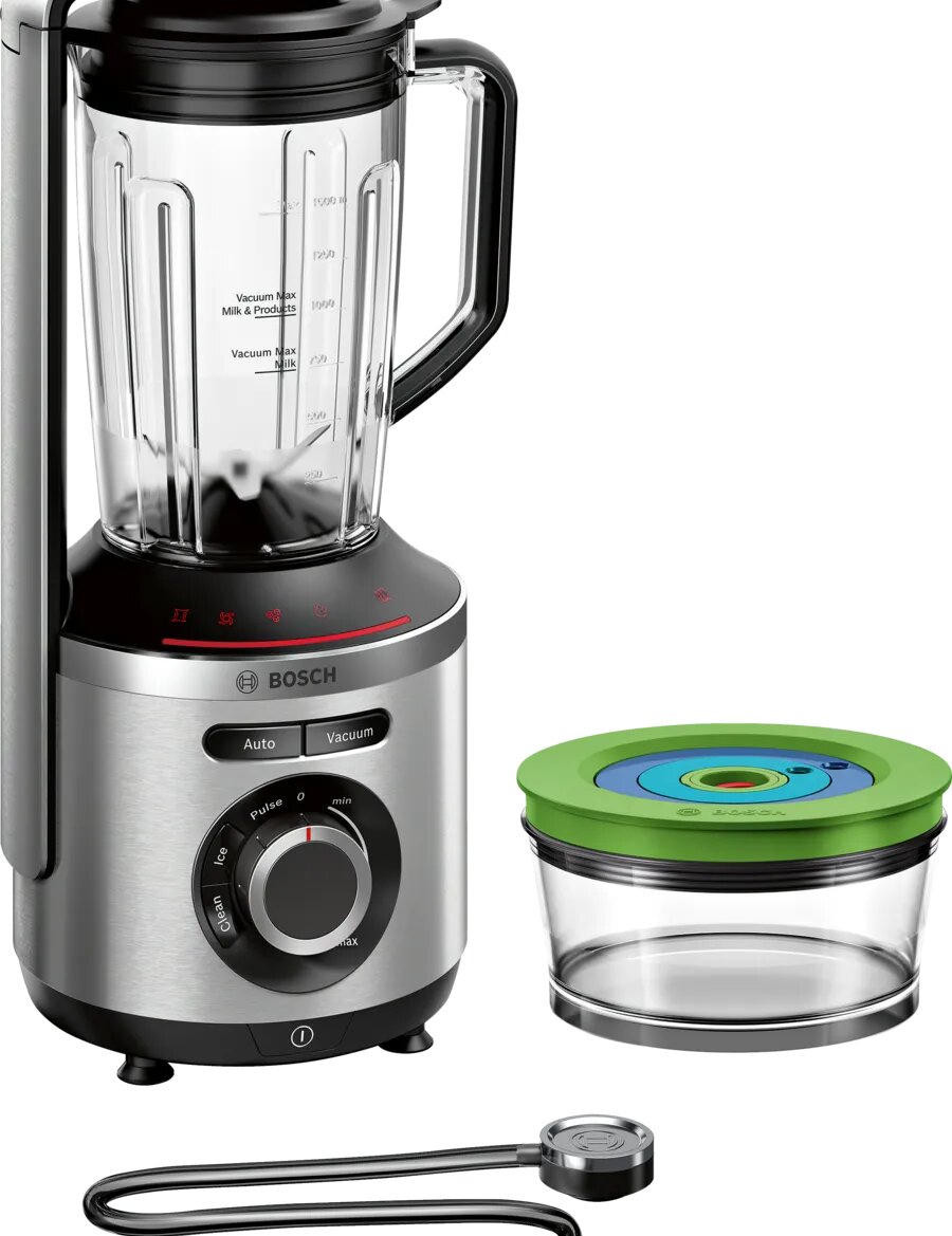 Блендер вакуумный Bosch MMBV622M - это высококачественная, функциональная и надежная кухонная техника, которая станет незаменимым помощником в приготовлении различных блюд. Дизайн блендера выполнен в стильном и современном виде. Цвет нержавеющей стали придает ему элегантность и делает его универсальным для любого интерьера кухни. Корпус из алюминия обеспечивает прочность и долговечность, а материал чаши измельчителя - тритан - гарантирует безопасность использования. Вакуумный блендер Bosch MMBV622M оснащен ножом с 6 лезвиями специальной формы, что обеспечивает эффективное измельчение и смешивание ингредиентов. Благодаря наличию бесступенчатой регулировки скорости, можно выбрать оптимальный режим работы для различных продуктов. Это устройство также имеет автоматические режимы, включая колку льда, вакуум, вакуумное смешивание и очистку, что делает его многофункциональным и удобным в использовании.