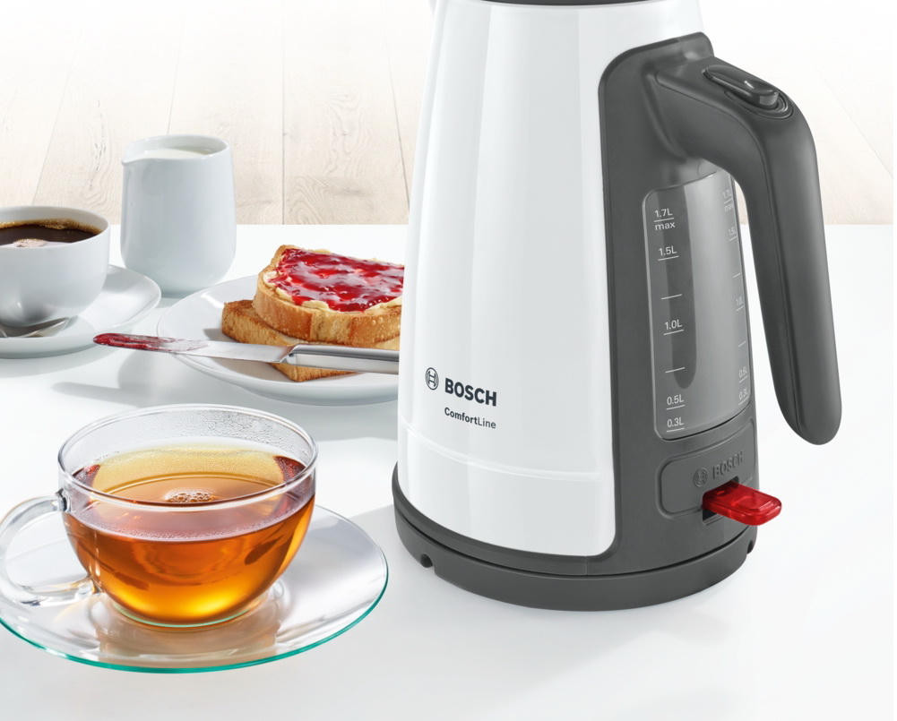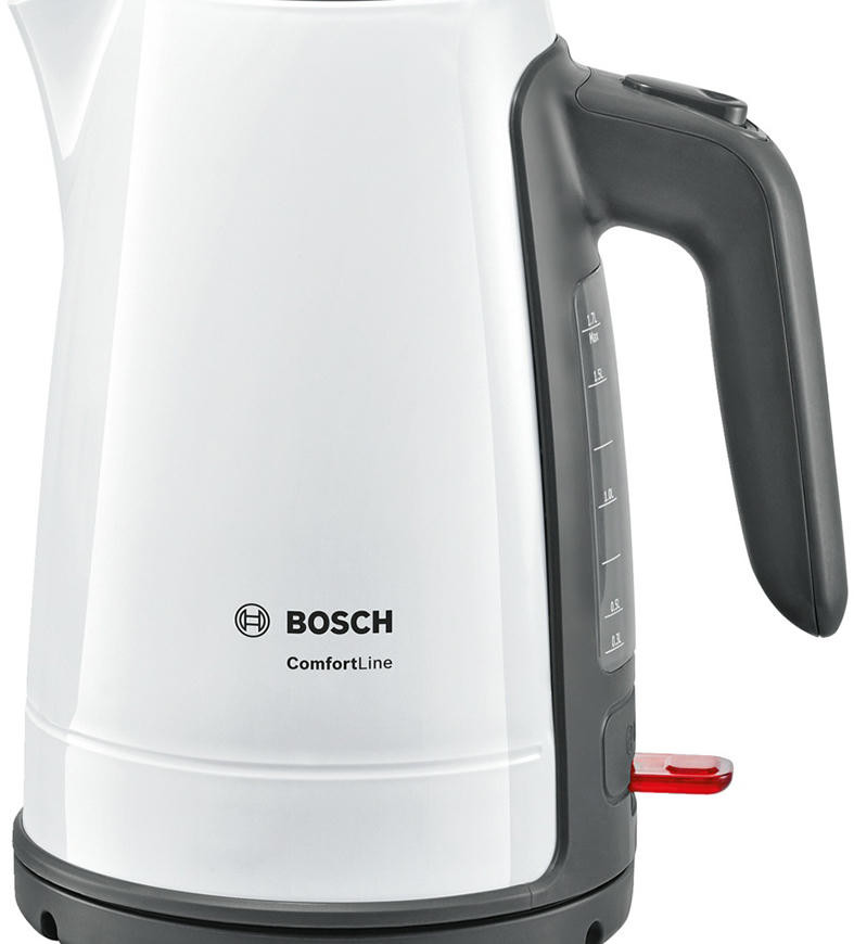 Чайник Bosch TWK 6A011 автоматически прекращает работу при отсутствии воды и при перегреве, гарантируя безопасное использование. Крышка открывается нажатием на кнопку, поэтому наполнить чайник водой можно, держа его в одной руке.