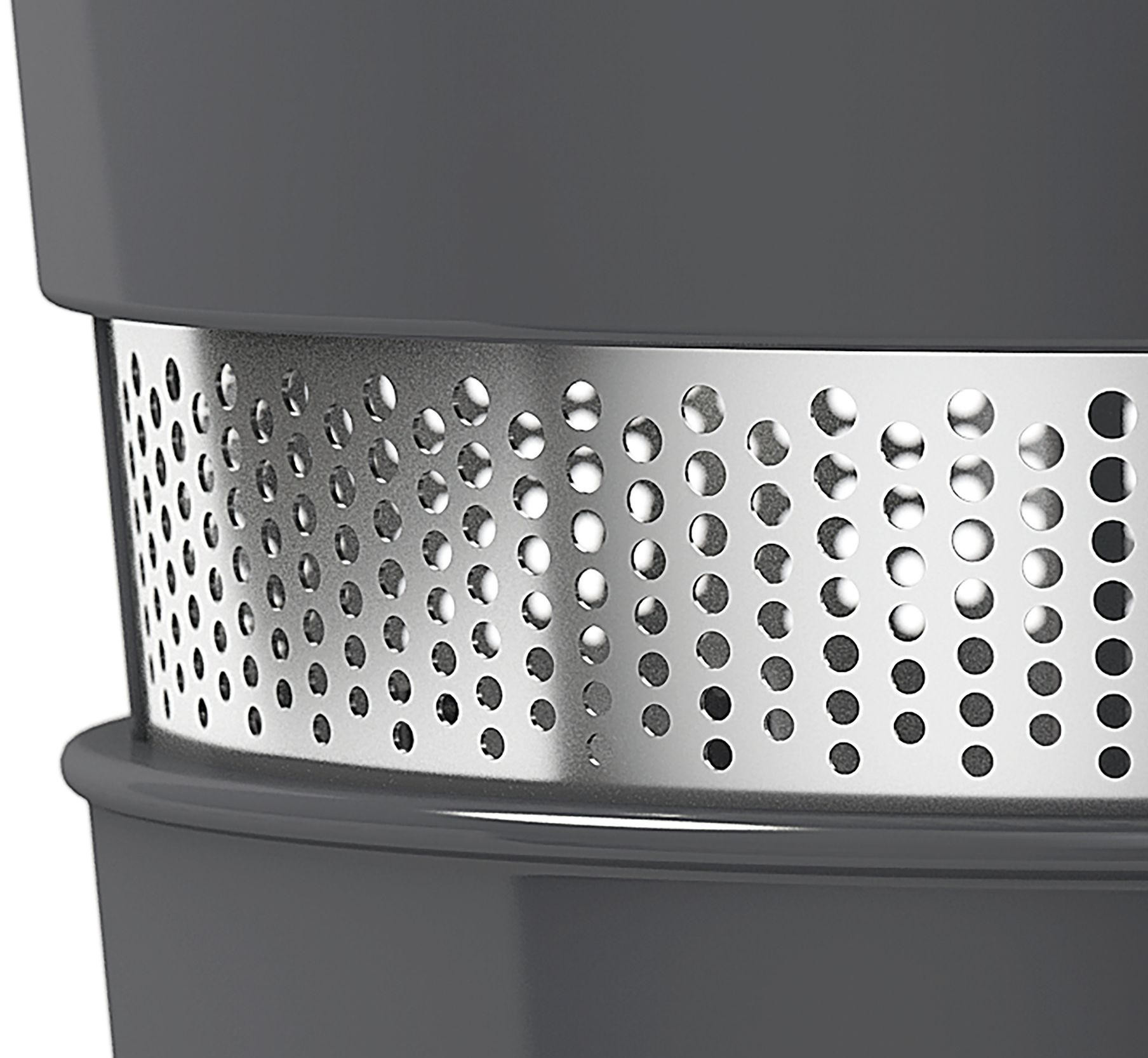 Прочный материал справляется даже с орехами и замороженными фруктами и овощами. При этом сохраняются питательные вещества и витамины. Силиконовые скребки на центрифуге перемешивают жидкость внутри чаши, что важно при измельчении разных ингредиентов. При помощи функции реверса можно извлечь застрявшие продукты и кожицу.