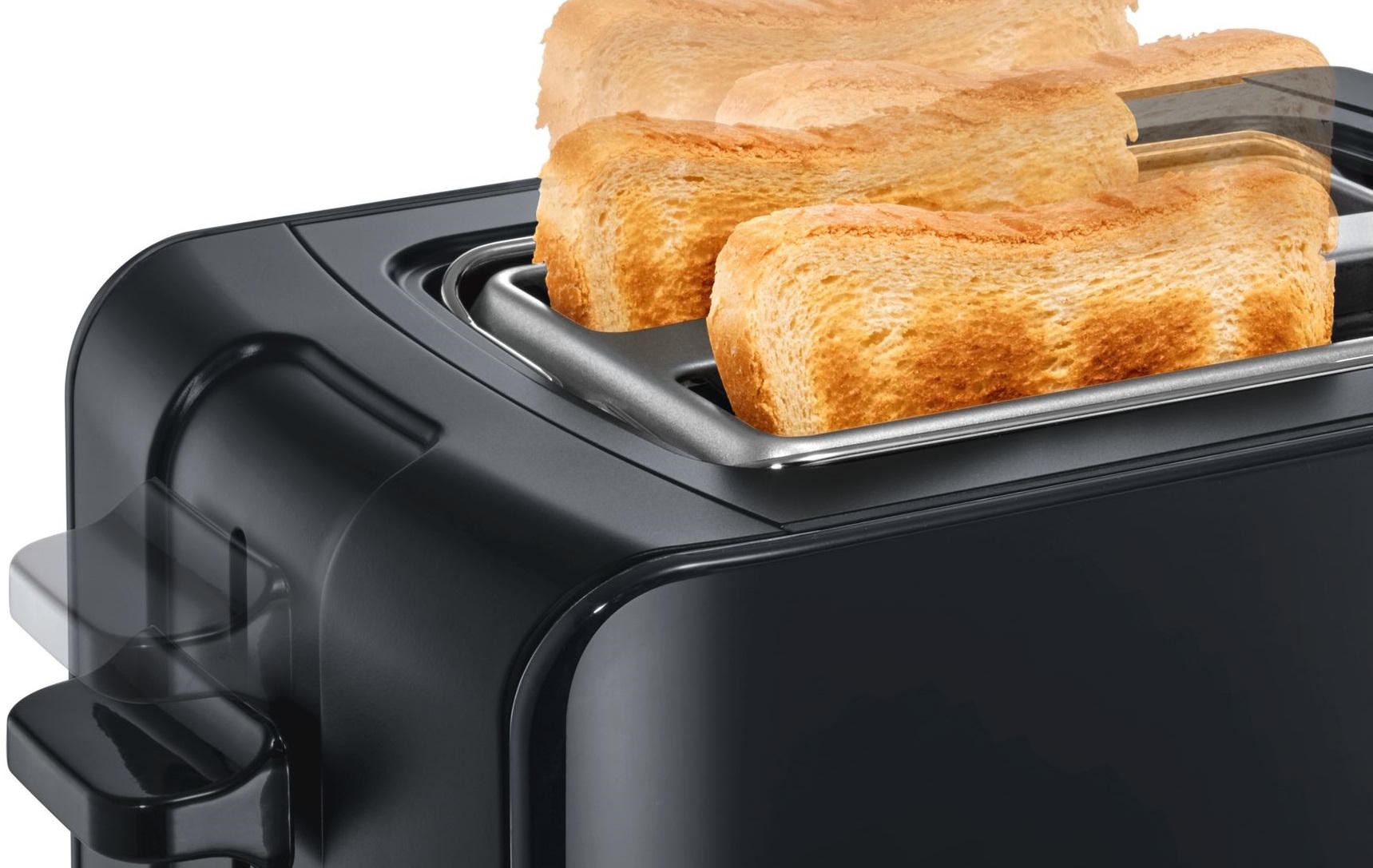 Компактный тостер Bosch TAT 6A113 для приготовления двух ломтиков хлеба. Бесступенчатый терморегулятор с интегрированной функцией подогрева позволяет выбрать нужную степень поджаривания хлеба, автоматическое центрирование обеспечивает равномерность прожарки. Для приготовления замороженных тостов нужно нажать на отдельную подсвеченную клавишу. Для извлечения небольших ломтиков хлеба предусмотрен высокий подъем решетки.