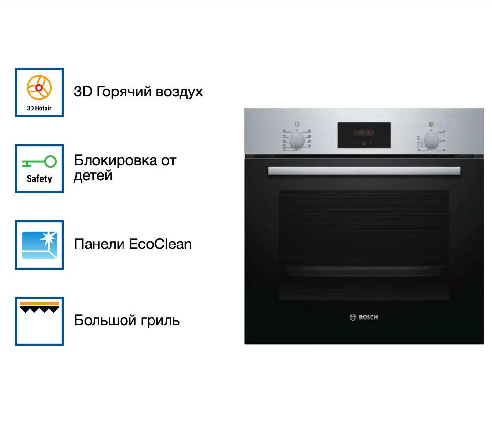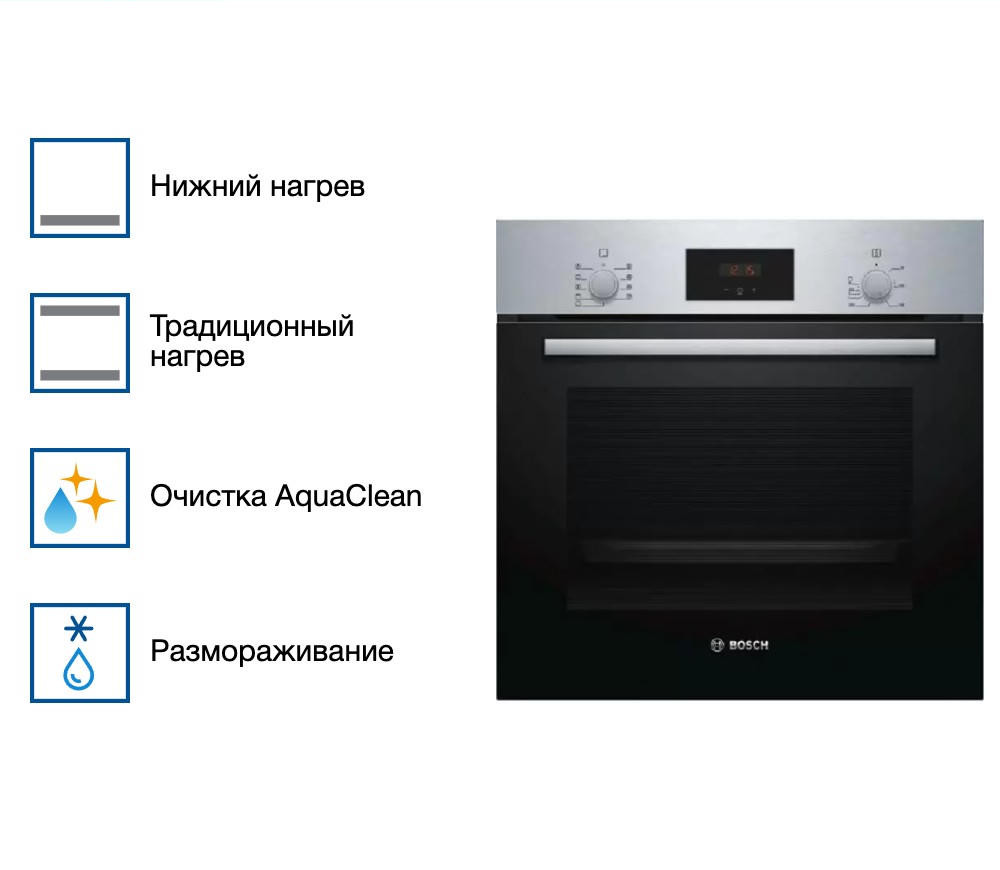 Электрический духовой шкаф Bosch HBF114ES0 есть внутренняя камера объемом 66 л, оснащенная галогенной подсветкой. Пользователь может выбирать один из семи режимов работы устройства или создавать индивидуальные программы для приготовления различных блюд. Благодаря технологии равномерной термической обработки «3D-горячий воздух» снижен риск пригорания пищи. Прибор оборудован электрическим грилем, который помогает получать хрустящую корочку.