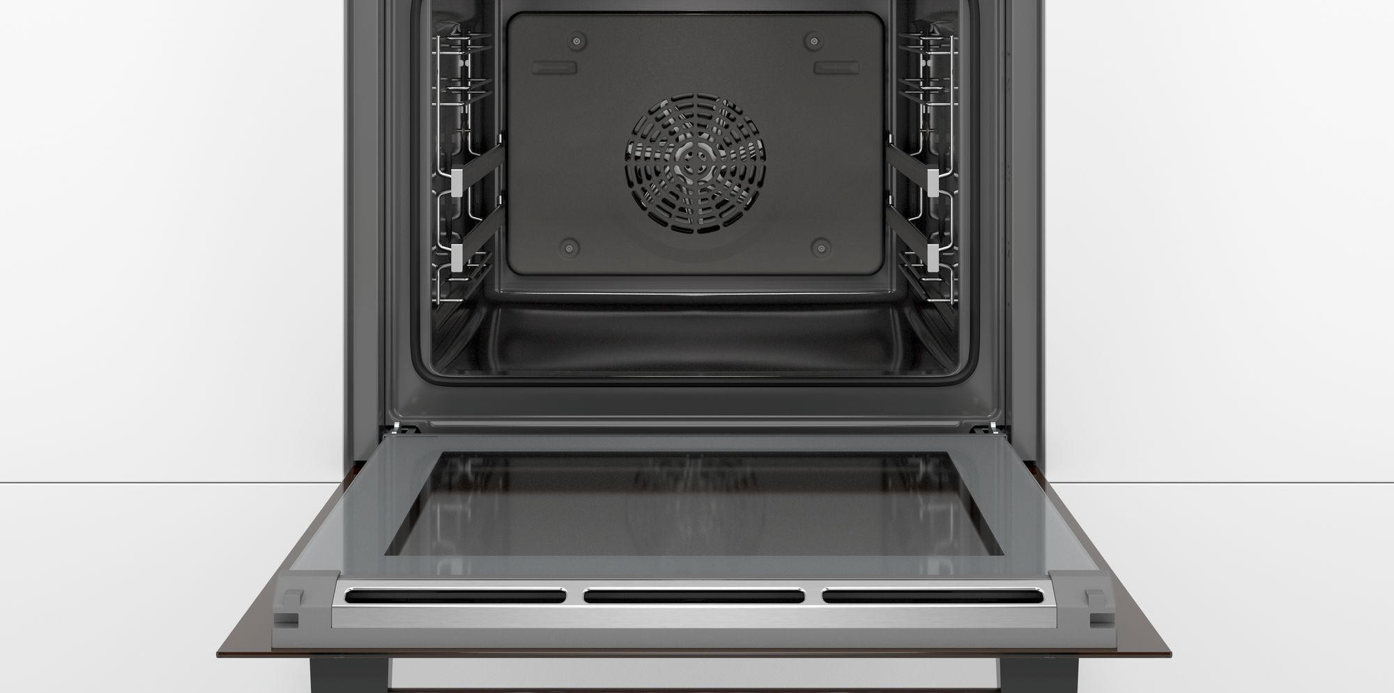Bosch HBG537YM0R — это электрический духовой шкаф коричневого цвета объёмом 71 л. Камеру внутри освещает галогенная лампочка мощностью 25 Вт. Есть дисплей с индикацией температуры. Уровней установки противней — пять, в том числе два — с телескопическими направляющими. Предусмотрена блокировка от детей с возможностью настройки. В комплекте идут два противня (универсальный и эмалированный) и комбинированная решётка.