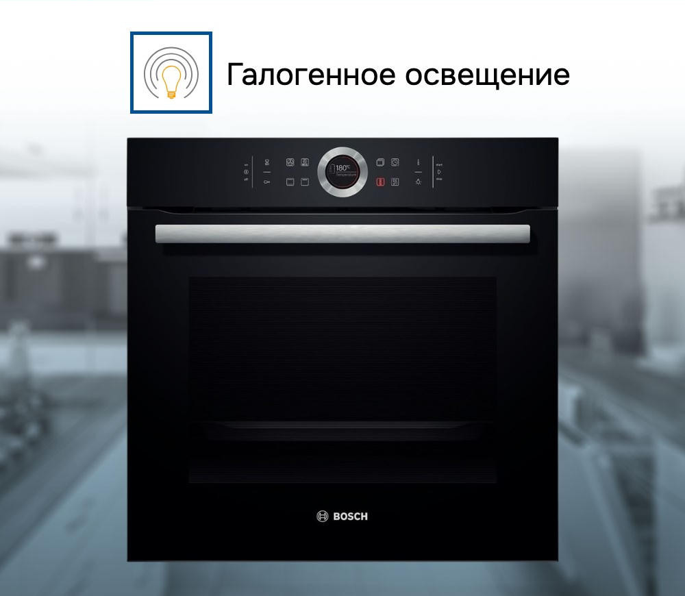 Духовой шкаф Bosch HBG634BB1 оснащен TFT-дисплеем, базовые установки которого помогут подобрать удобную лично вам яркость дисплея или выбрать ночной режим освещения. Само освещение можно включать и отключать, не прерывая процесс готовки.