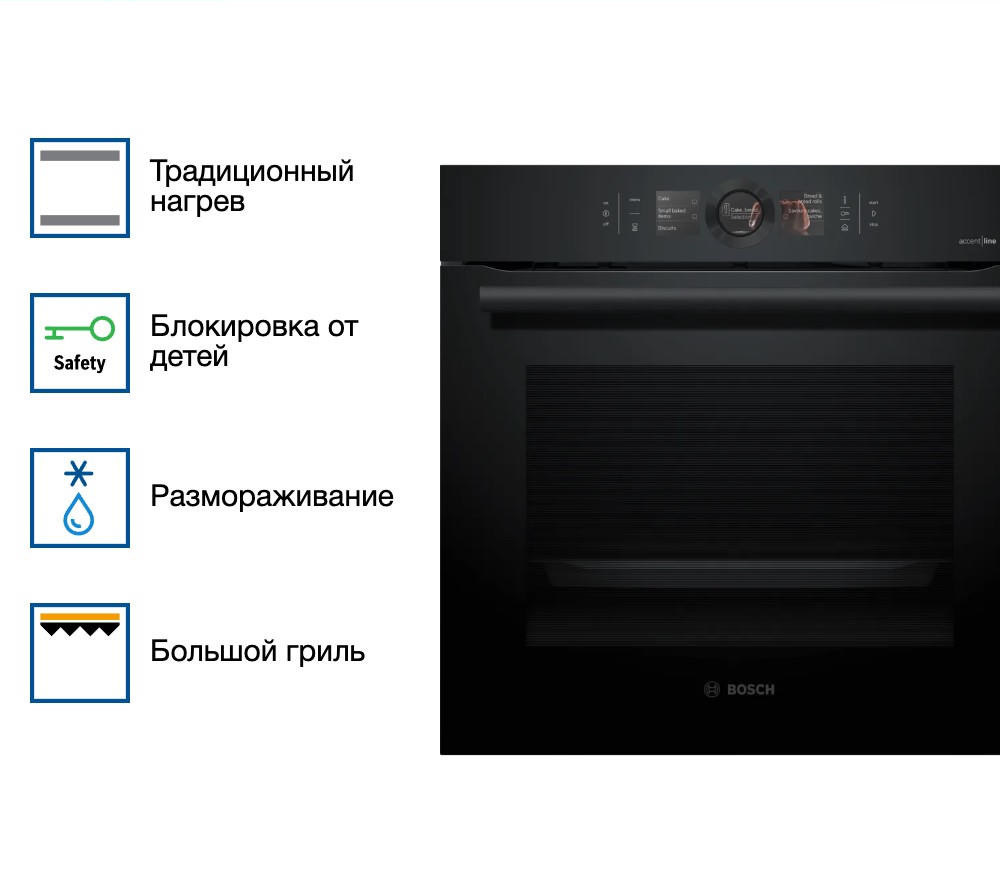 Дисплей 7.5_ цветной TFT с сенсорными кнопками обеспечивает четкую и яркую картинку, позволяя легко выбирать нужные настройки. Духовой шкаф оснащен 16 режимами нагрева, включая 4D-горячий воздух, горячий воздух Gentle и ECO, верхний/нижний жар и другие. Такой выбор гарантирует идеальный результат приготовления любого блюда. Благодаря функции автоматического быстрого разогрева, духовка готова к работе в кратчайшие сроки. Для тех, кто предпочитает здоровое питание, предусмотрен режим приготовления на пару. В комплекте идут специальные емкости для этого режима. Также стоит отметить наличие многоточечного термощупа PerfectRoast и сенсора для выпечки PerfectBake, которые обеспечивают точное соблюдение температурного режима и гарантируют отличный результат.