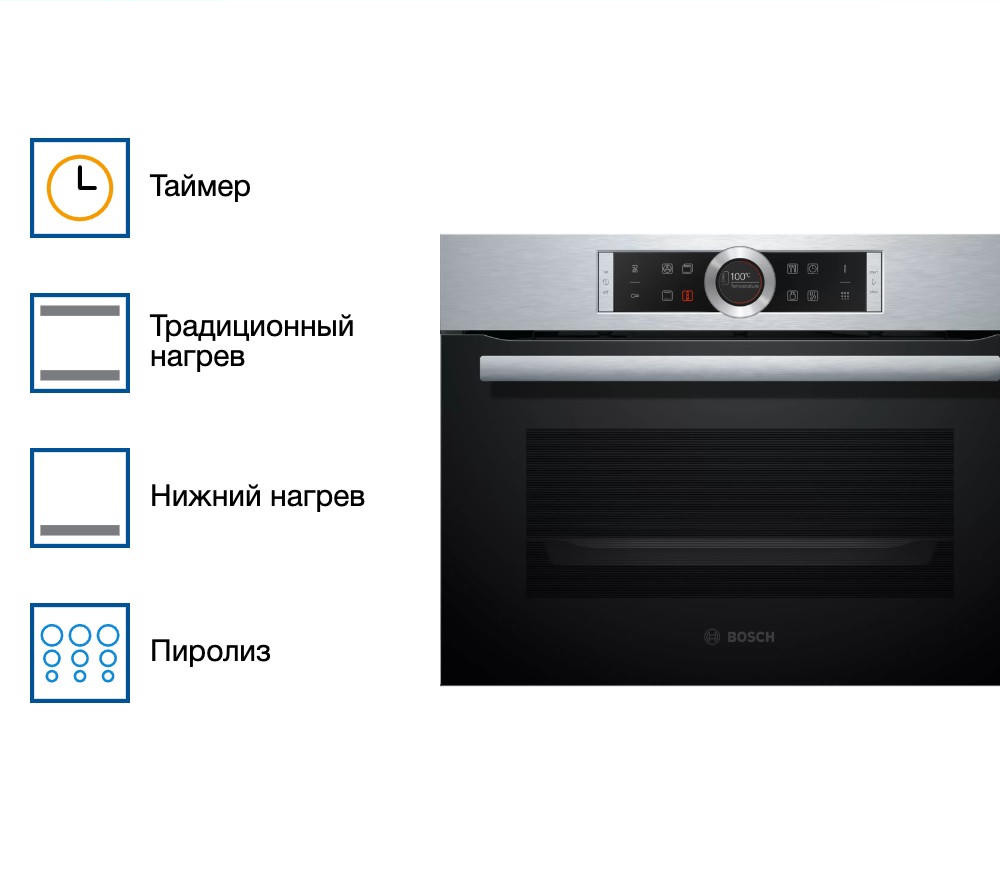 Компактный электрический духовой шкаф Bosch CBG675BS3 - это высокотехнологичный прибор, который сочетает в себе стильный дизайн и передовые функциональные возможности. Отличительной чертой является компактность прибора, что позволяет его удобно разместить даже на небольшой кухне. Дизайн духового шкафа выполнен в строгом и современном стиле. Отделка из нержавеющей стали придает прибору элегантность и делает его устойчивым к коррозии. Прибор оснащен электронным управлением с сенсорными переключателями Control Ring, что обеспечивает удобную и точную настройку режимов работы. Особенности функционала этой модели впечатляют. Прибор обладает внушительным количеством режимов нагрева - целых 13, включая 4D-горячий воздух, верхний/нижний жар, большой и малый гриль, режим для пиццы, бережное тушение, подогрев посуды и даже автоматическое приготовление AutoPilot. Внутренний объем шкафа составляет 47 литров, что позволяет готовить большие порции еды одновременно. Температура нагрева может варьироваться в диапазоне от 30 до 300 градусов Цельсия, что позволяет точно настроить температурный режим для каждого блюда.