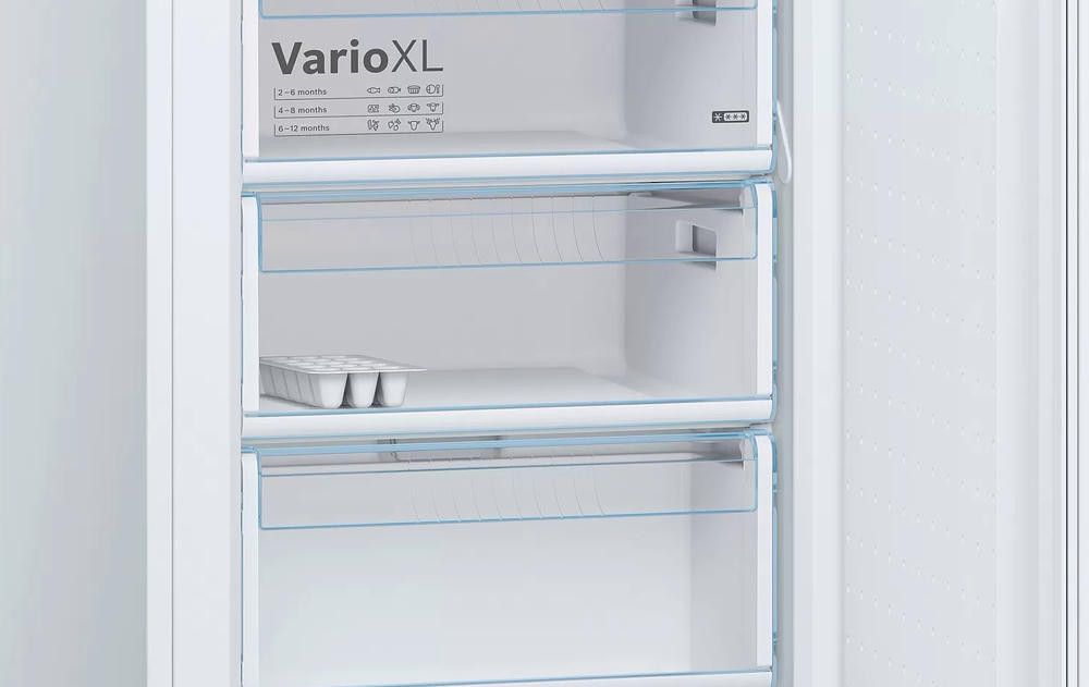Морозильная камера имеет полезный объем в 94 л и расположена в нижней части прибора. Оснащена 3 прозрачными ящиками для хранения. В случае отключения электроэнергии продукты в морозилке могут храниться в течение 22 часов. Есть автоматический режим суперзамораживания.
