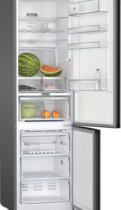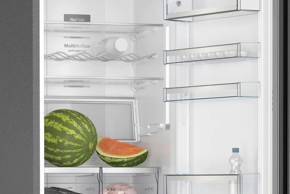 Двухкамерный холодильник Bosch KGN39AX32R выполнен в модном цвете "чёрная нержавеющая сталь" и имеет на стенках и дверце специальное покрытие от отпечатков пальцев. С помощью приложения Home Connect вы сможете задать необходимые настройки температуры и режима прямо со своего смартфона или планшета, а если дверца холодильника останется открытой, то вы немедленно получите уведомление на своё мобильное устройство.